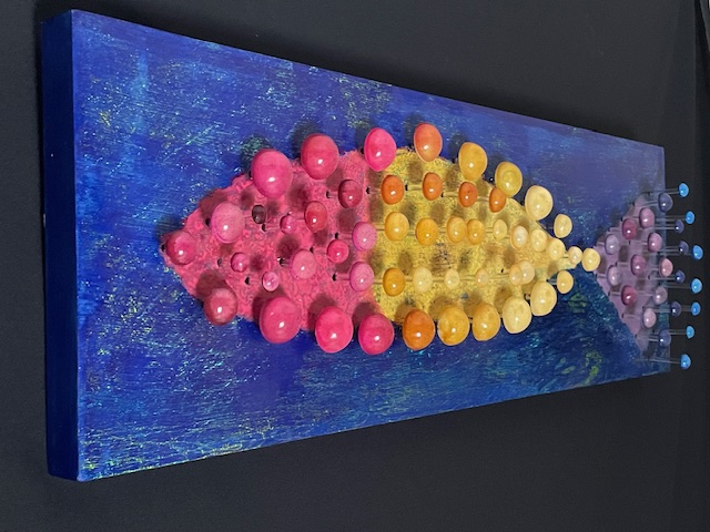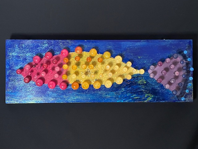 Swimming Rainbow | 36″ x 12″ x 1.5″ | Wooden Cradle Board with an abstract ocean scene, alcohol ink colored resin domes mounted at different heights in the outline of a fish.